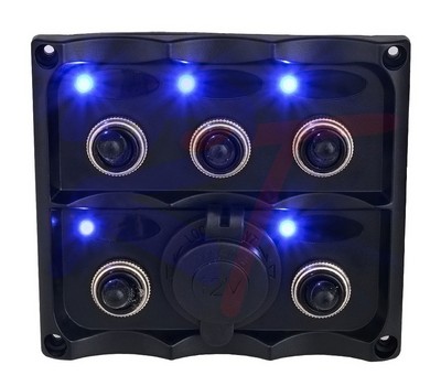 Оснащена пятью двухпозиционными выключателями, 3 плавкими предохранителями 15А и гнездом прикуривателя с герметичной крышкой. Материал - пластмасса. Размеры 100х110 мм.
