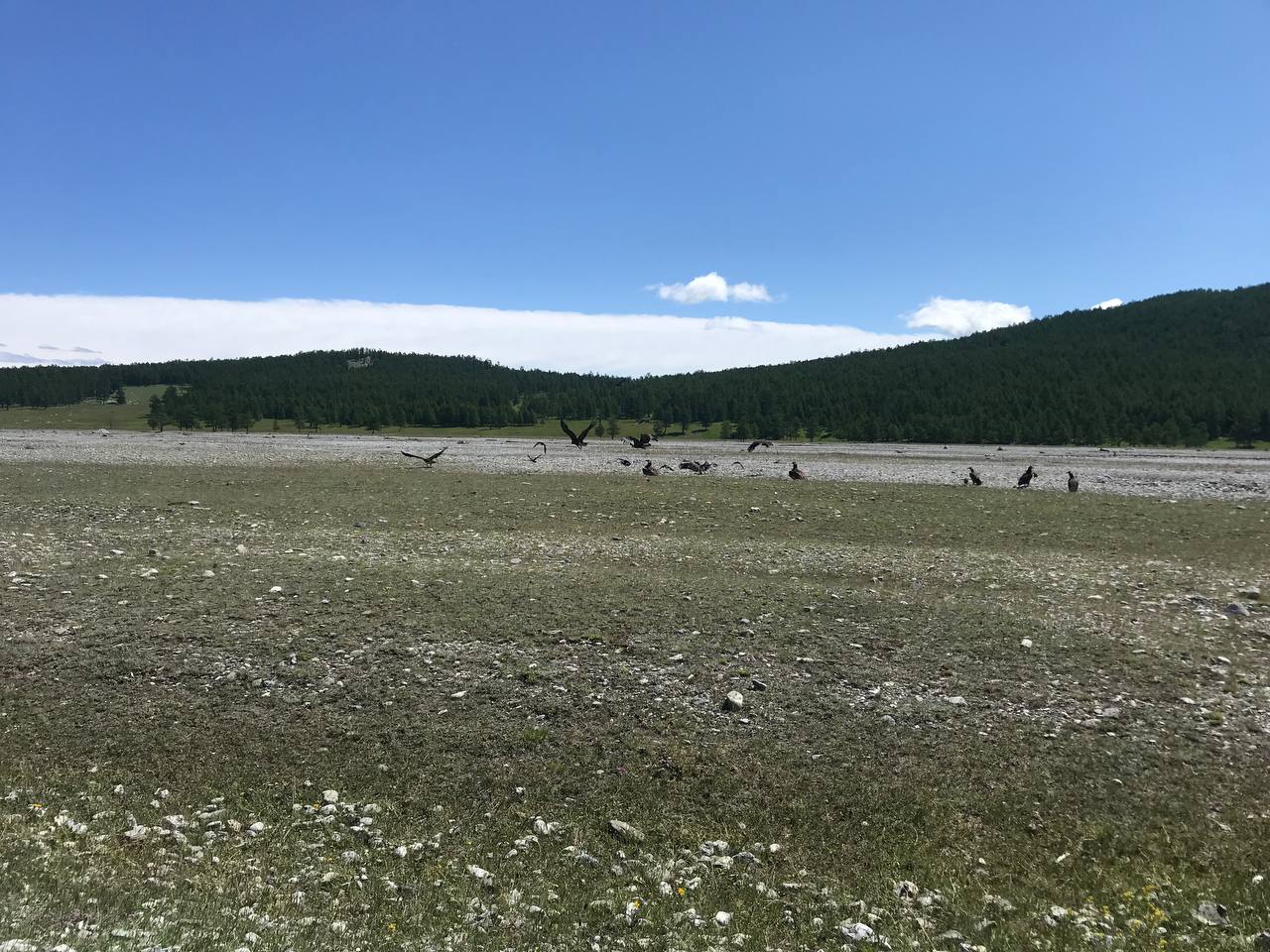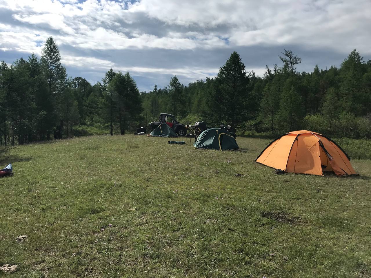 Слава богу - дождь ночью закончился и следующий день порадовал нас тёплым солнечным светом. Недалеко от нашего лагеря прошёл огромный пепельного цвета одичавший як-одиночка. Его свисающая до земли шерсть и шикарный длинный хвост серебрились в каплях росы, тяжело ступая и мотая брутальной, украшенной длинными, гнутыми как сабли рогами, он тихо растворился в утреннем тумане. Мы позавтракали, собрали лагерь и двинулись дальше. С перевала открылся широкоформатный вид на пройденный нами путь и долину по которой замысловато петлял Их-хоро-гол. Фантастика! Дальше дорога шла по зеленым камням, по краю горного болота, мимо скал и осыпей и небольших озёр, иногда она была не читаема и угадывалась только по небольшим пирамидкам из сложенных людьми булыжников. Постепенно подъехали к серпантину и начали спускаться в узкое лесистое ущелье, по дну которого бежала шумная пенистая река - Шаргын-гол. Влажный воздух был наполнен душистыми пихтовыми и папоротниковыми ароматами, мы проехали большой кедрач и выехали к минеральным источникам. На источниках отдыхали Монгольские туристы, организовав небольшой лагерь из юрт, шалашей и палаток. Здороваемся, знакомимся, спрашиваем про уровень воды в реках Дархадской котловины. Говорят – в Цагааннуур не проедем – река поднялась. На всякий случай, мы решили проверить эту информацию (мало ли что кто говорит, а может мы их не правильно поняли) доехали до бродов, походили – посмотрели, стало ясно, что поиски перехода бесполезны – слишком большое течение и глубина. Решили ехать до посёлка Рэнчинахумбе. Дорога шла по просторной живописной степи пролегающей вдоль горного образования – хребта «Баяны нурхуу», мимо огромного ледника от ещё не растаявшей речной наледи. Поражали ароматы полыни и ещё каких-то трав, бескрайние просторы и белоснежные облака над горными вершинами, ярко зелёная трава и полнейшее отсутствие мусора. Остановились на ночлег, специально переехав песчаную речушку, на небольшой островок между двумя тихими протоками, и расположили лагерь на уютной полянке с бархатной травой, окруженной стройными лиственницами – прекраснейшее место с девственной природой.