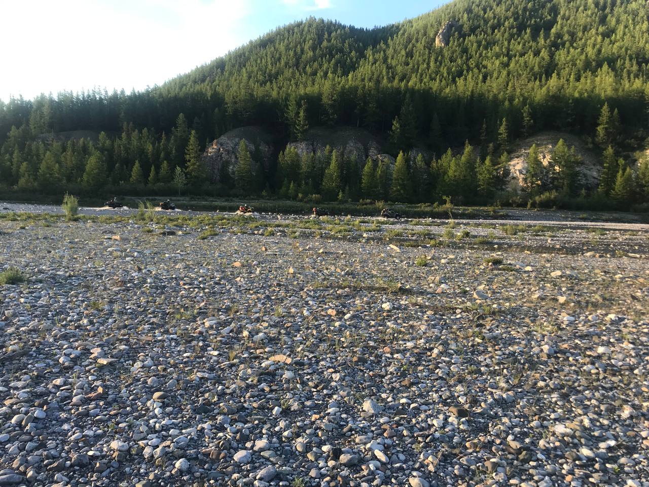 Течение слабое, вроде и не глубоко, но есть ямы, вода мутная, ничего не видно, шаг вправо шаг влево – воды по пояс. Ходили бродили в разных местах по руслу, нашли тропу по дну, воткнули палки-вехи, на трёх квадриках след в след переехали на другой берег, добрались до стоящей в реке Багги с трясущимся от холода Антоном, вытащили её из воды, вернулись за остальными, к тому времени утопленный квадрик уже оживили и мы все переехали на другой берег. Уже по темноте разбили лагерь у подножия перевала, поужинали, немного выпили и уставшие завалились спать.