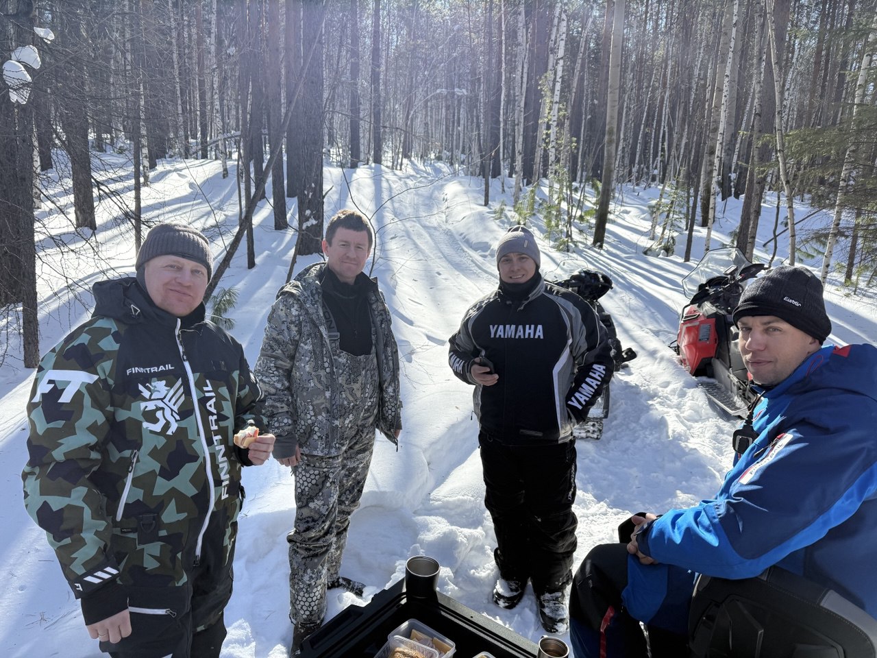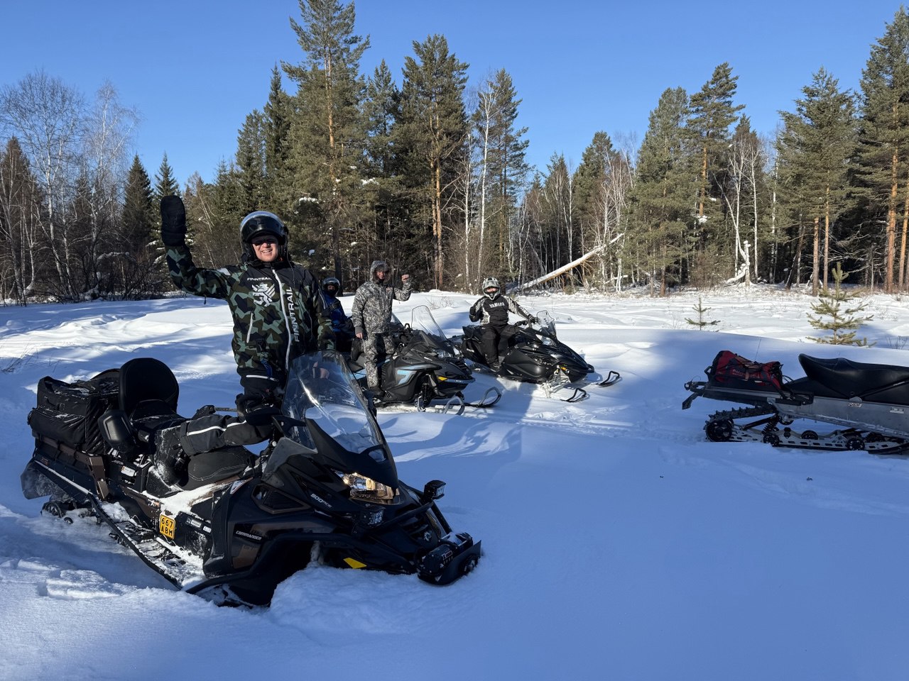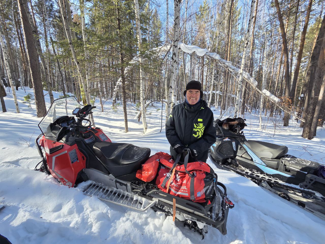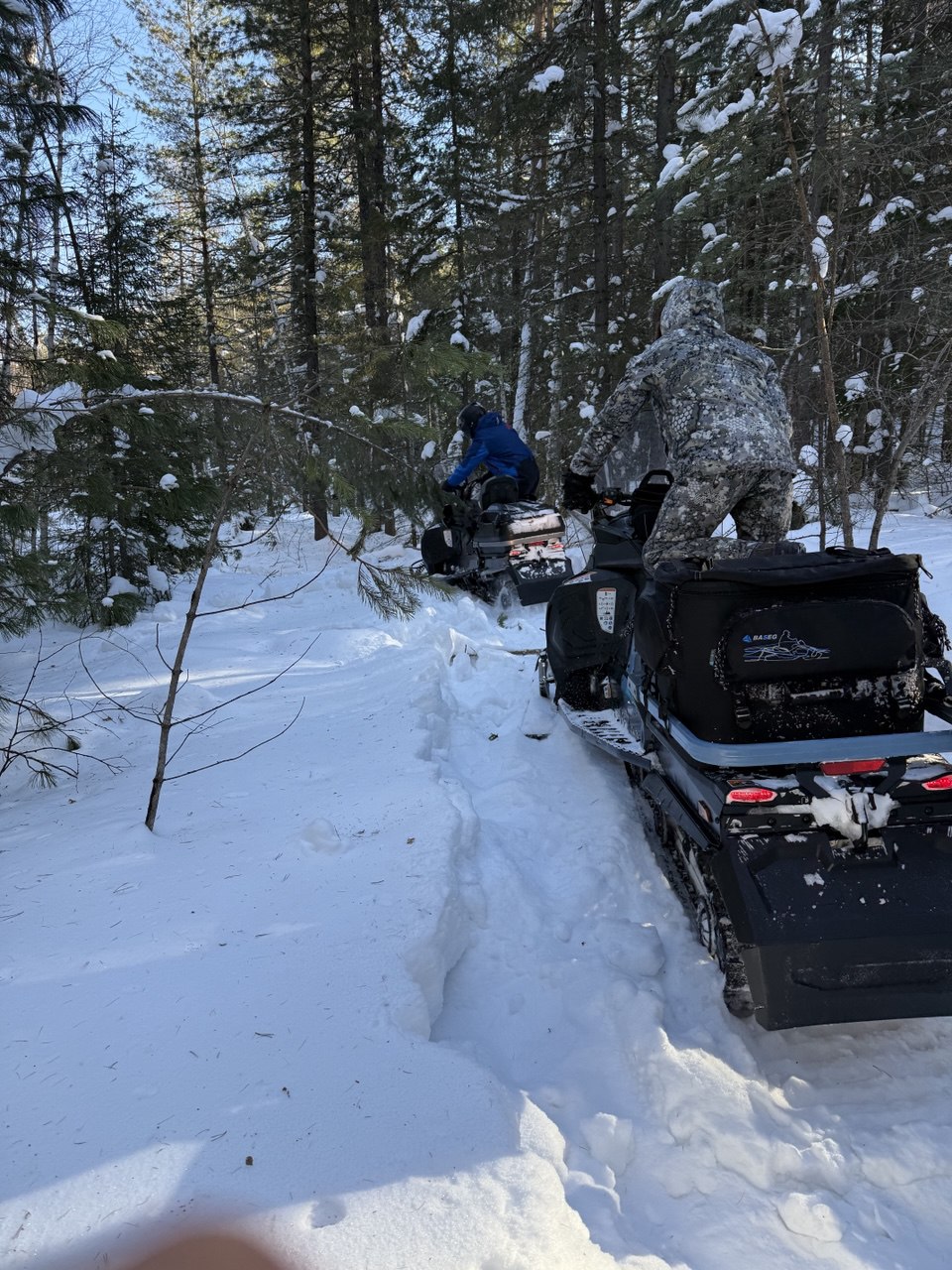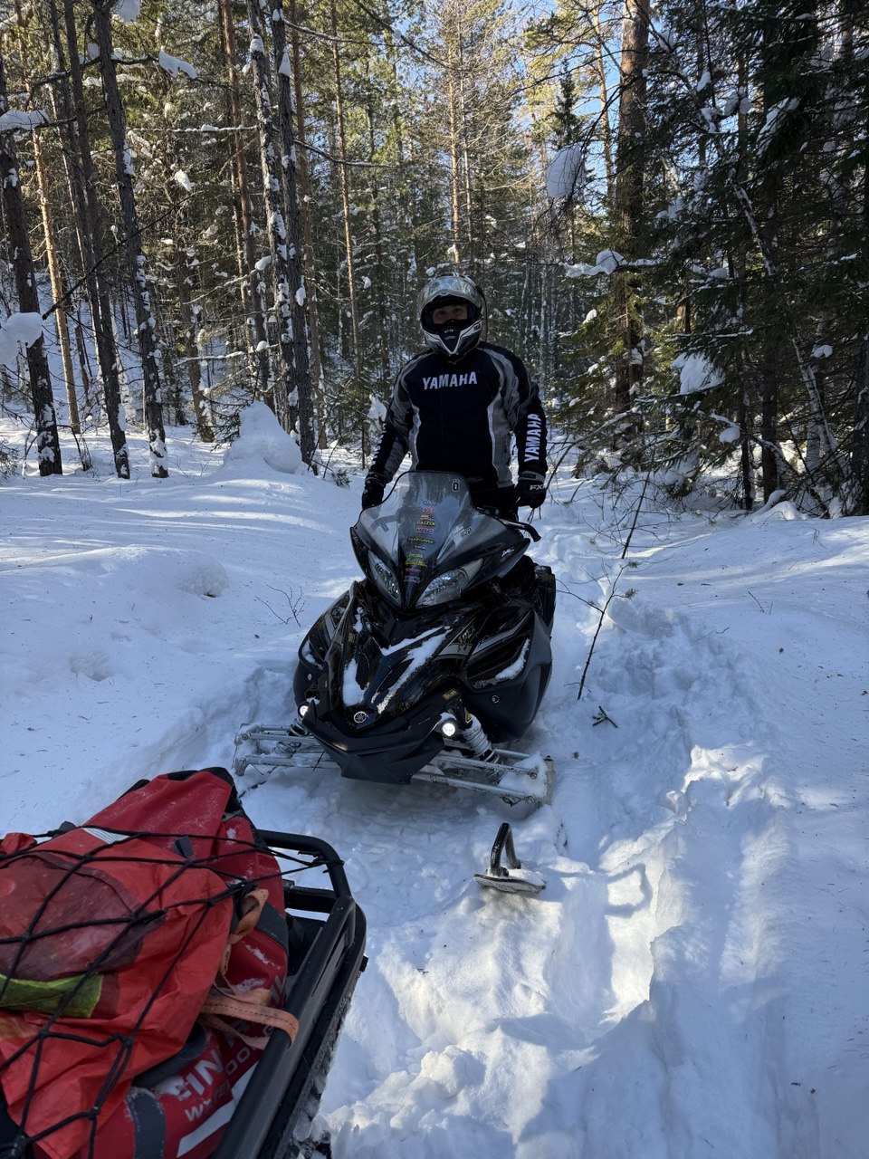 Едем вперёд, тропим по очереди, жарко, у каждого голова и спина в поту. Идем медленно. Приходится рубить топором склонившиеся под тяжестью снега преграждающие дорогу ветки деревьев. Кросач тропить не может – ему нужно пространство для манёвра чтобы идти на большой скорости, зато на открытых участках летает по тропе как на глиссере! Едем, рулим по звериным и охотничьим тропкам, получаем удовольствие: снега – немеряно!