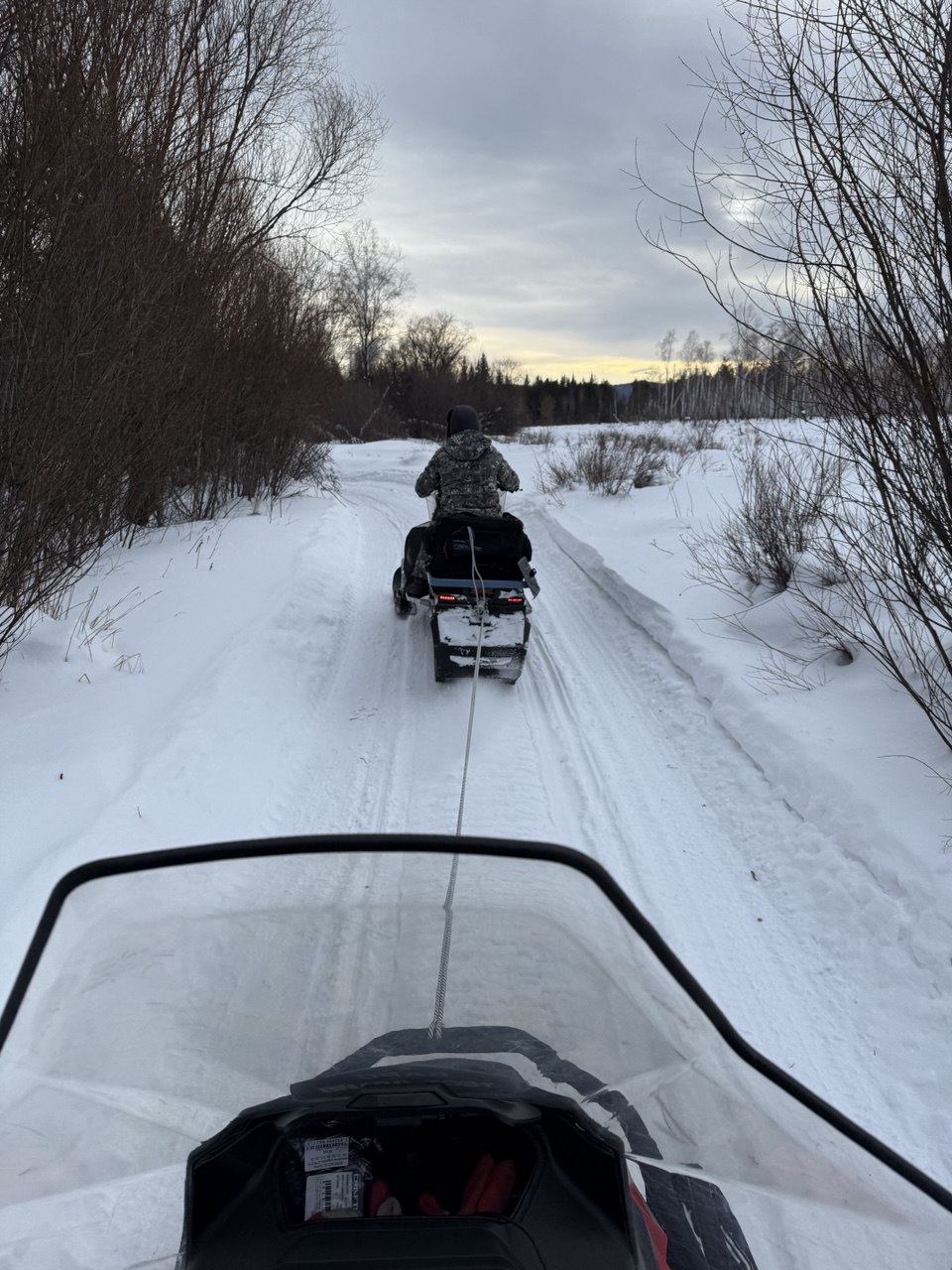 До Тальцинского кордона дорога укатана квадриками. На снегоходах ехать стрёмно – валимся из колеи в колею. Вдруг, ни с того ни с сего, мой снегоход заглох. Выясняем – проблема с подачей электропитания. То есть, то нет - где-то плохой контакт. Проверили предохранители , релюшки, аккумулятор, подёргали провода – бесполезно, проблему не нашли. Пришлось почти от Кордона тащить снегоход на тросе до площадки Тальцинского музея, там и оставили снегоход до утра.