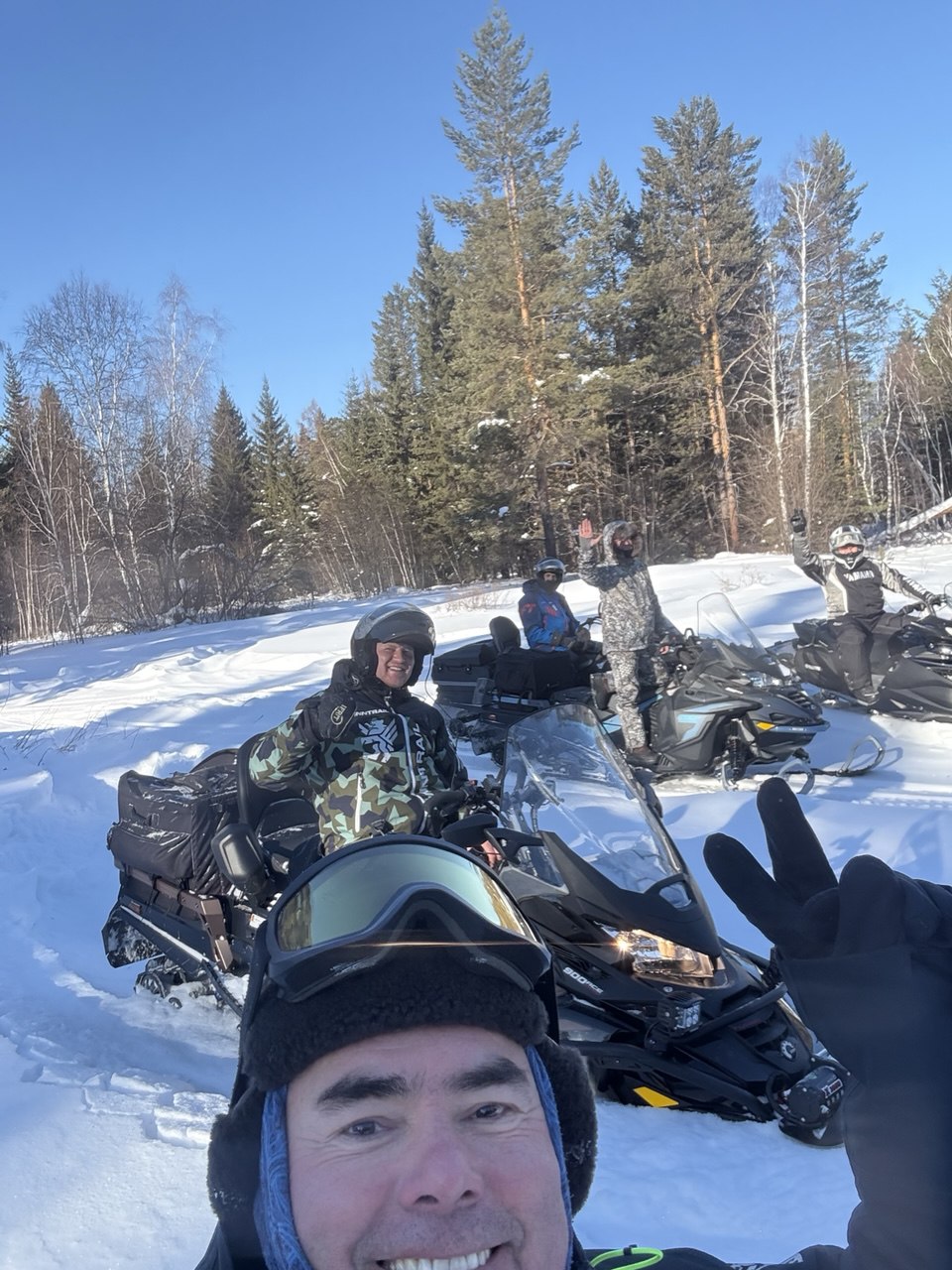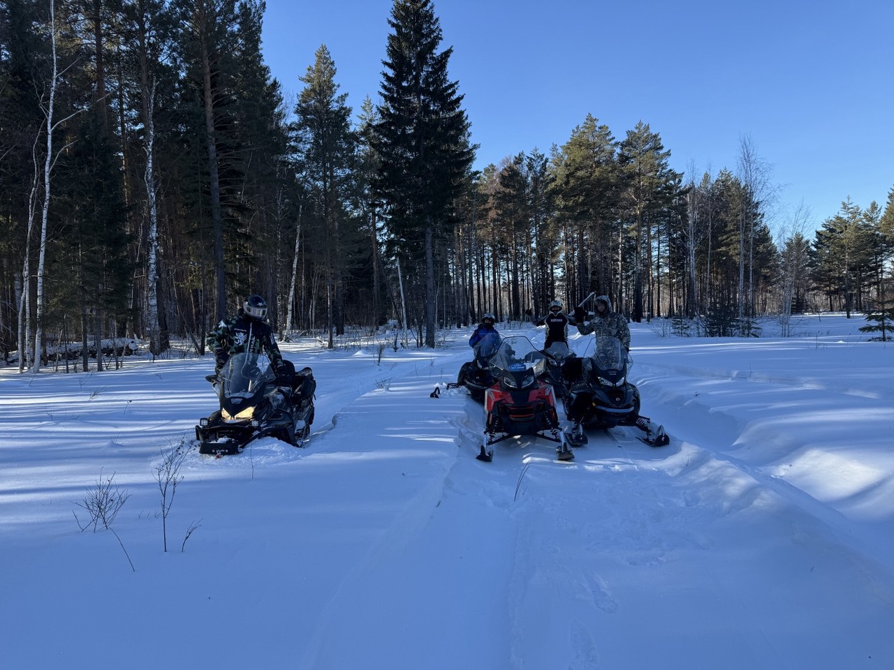 Едем вперёд, тропим по очереди, жарко, у каждого голова и спина в поту. Идем медленно. Приходится рубить топором склонившиеся под тяжестью снега преграждающие дорогу ветки деревьев. Кросач тропить не может – ему нужно пространство для манёвра чтобы идти на большой скорости, зато на открытых участках летает по тропе как на глиссере! Едем, рулим по звериным и охотничьим тропкам, получаем удовольствие: снега – немеряно!